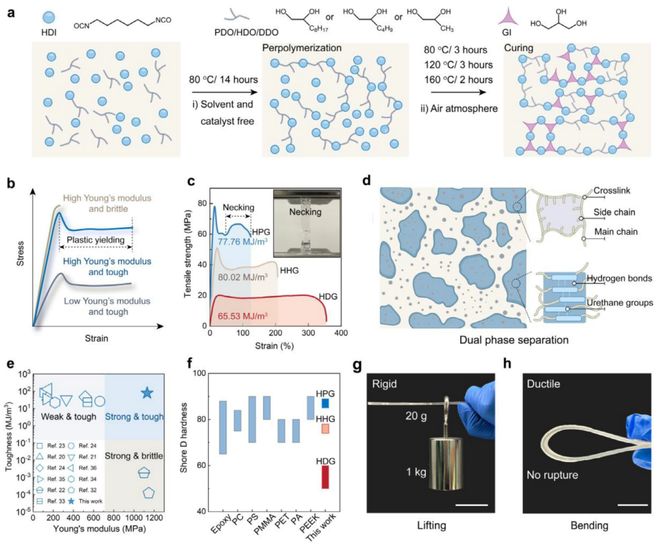 图1:可回收聚氨酯热固性材料的合成与力学性能 a) 可回收聚氨酯热固性材料的合成路线;b) 不同玻璃态聚氨酯热固性材料的应力-应变曲线示意图;c) 可回收聚氨酯热固性材料的工程应力-应变曲线,插图为HPG样品拉伸过程中的颈缩现象;d) HPG中双相分离结构的示意图;e) 文献中增韧聚氨酯热固性材料的韧性-杨氏模量散点图;f) 可回收聚氨酯热固性材料与商业塑料的硬度对比;g) HPG样品(重20克)提升1公斤重物的照片;h) HPG展示其延展性的照片(比例尺=3厘米)。