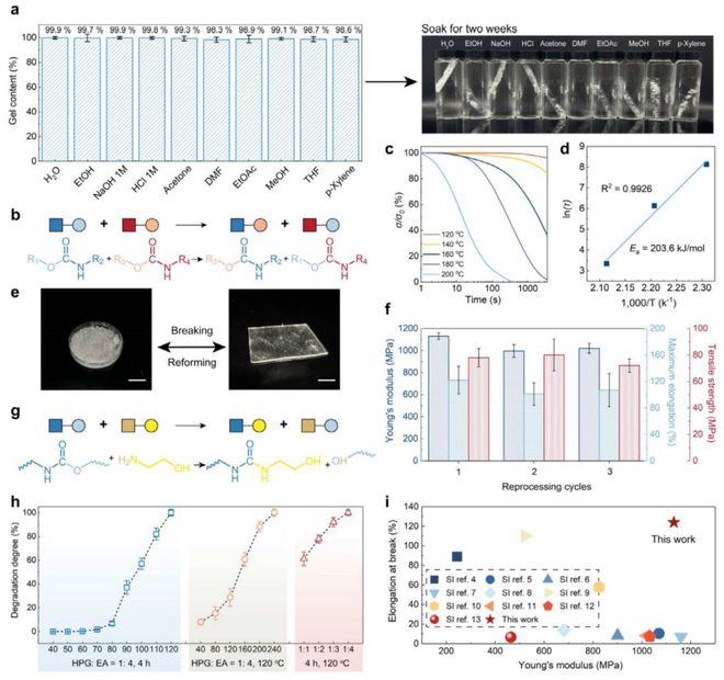 图3:HPG可回收性评估 a) 左:HPG在不同溶剂和酸/碱溶液中浸泡两周后的凝胶含量(误差棒为五次独立测量的标准偏差);右:浸泡两周后HPG样品未显著溶解的照片;b) 交联网络中的酯交换反应;c) 不同温度下HPG在3%等应变下的应力松弛曲线;d) 相应的Arrhenius曲线 h)回收的HPG样品照片(比例尺=1 cm);f) 不同再加工周期后HPG的力学性能(误差棒为三次独立测量的标准偏差);g) 交联网络中urethane的胺解反应;h) 时间、投料比和温度对EA降解HPG样品程度的影响(误差棒为三次独立测量的标准偏差);i) 其他可再加工聚氨酯热固性材料的断裂伸长率-杨氏模量散点图。