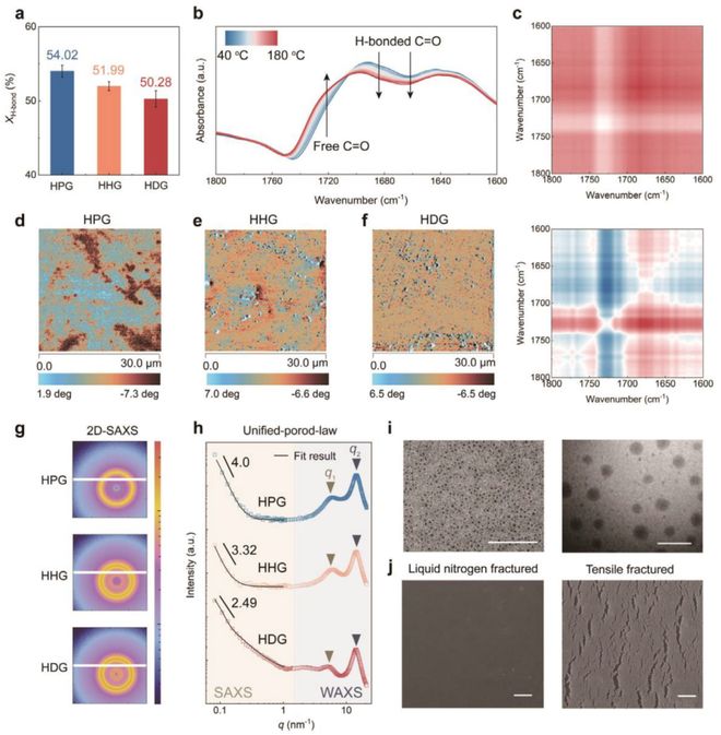 图2:分级相分离的表征 a) 可回收聚氨酯热固性材料的氢键比例(误差棒代表三次独立测量的标准偏差);b) 不同温度下C=O伸缩振动的FTIR光谱;c) HPG在1800–1600 cm⁻¹波段的二维相关同步(上)与异步(下)光谱;d-f) HPG、HHG和HDG的AFM相图;g) 可回收聚氨酯热固性材料的2D-SAXS图案;h) 一维SAXS-WAXS曲线;i) HPG切片的TEM图像,显示初级相分离(左;比例尺=1 μm)和次级相分离(右;比例尺=100 nm);j) HPG液氮断裂和拉伸断裂样品的SEM断面图像(比例尺=1 μm)。